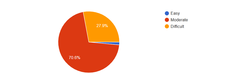 Based on student feedback, the overall difficulty level of the FMGE paper leaned largely towards moderate to difficult, with clear variation between sections. A significant number of students felt that while the first part of the paper was relatively easier or manageable, the second part turned more challenging and demanding.