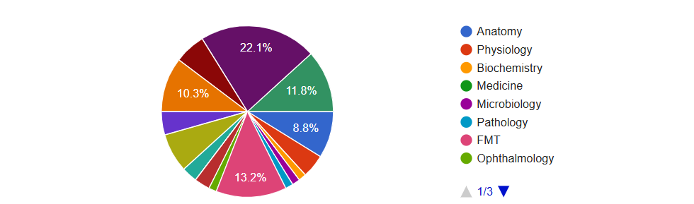 Analysis of the subject-wise distribution suggests that several foundational and para-clinical subjects received comparatively lower representation in the exam. Disciplines such as Anatomy, Physiology, and Microbiology appeared with a modest share of questions, indicating a reduced emphasis on detailed theoretical concepts and memorization-heavy areas. Similarly, Forensic Medicine (FMT) and Pathology showed limited weightage, with questions largely confined to commonly tested, high-yield topics rather than exhaustive coverage.